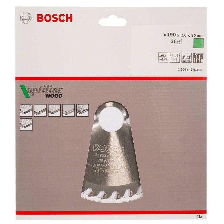 Циркулярен диск Bosch метален HM за рязане на дърво 190x30x2.6 мм, 36 z, Optiline Wood