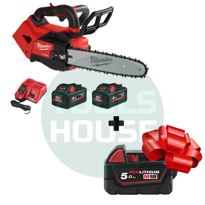 Акумулаторен верижен трион Milwaukee M18 FTHCHS30-802 с 2 батерии и зарядно, 18 V, 8 Ah, 30 см, 0.325 ", 1.1 мм + Подарък акумулаторна батерия Milwaukee M18 B5, 18 V, 5 Ah
